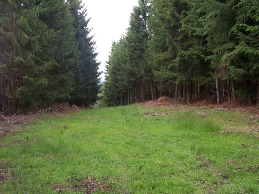 Mit hohem Kostenaufwand entstand, nach einer Rodung, diese Neuanlage einer 6 400 qm großen Äsungsfläche. Wurzeln und Abraum wurden als Windschutz am Rand der Fläche aufgeschichtet – Kastanien angepflanzt.